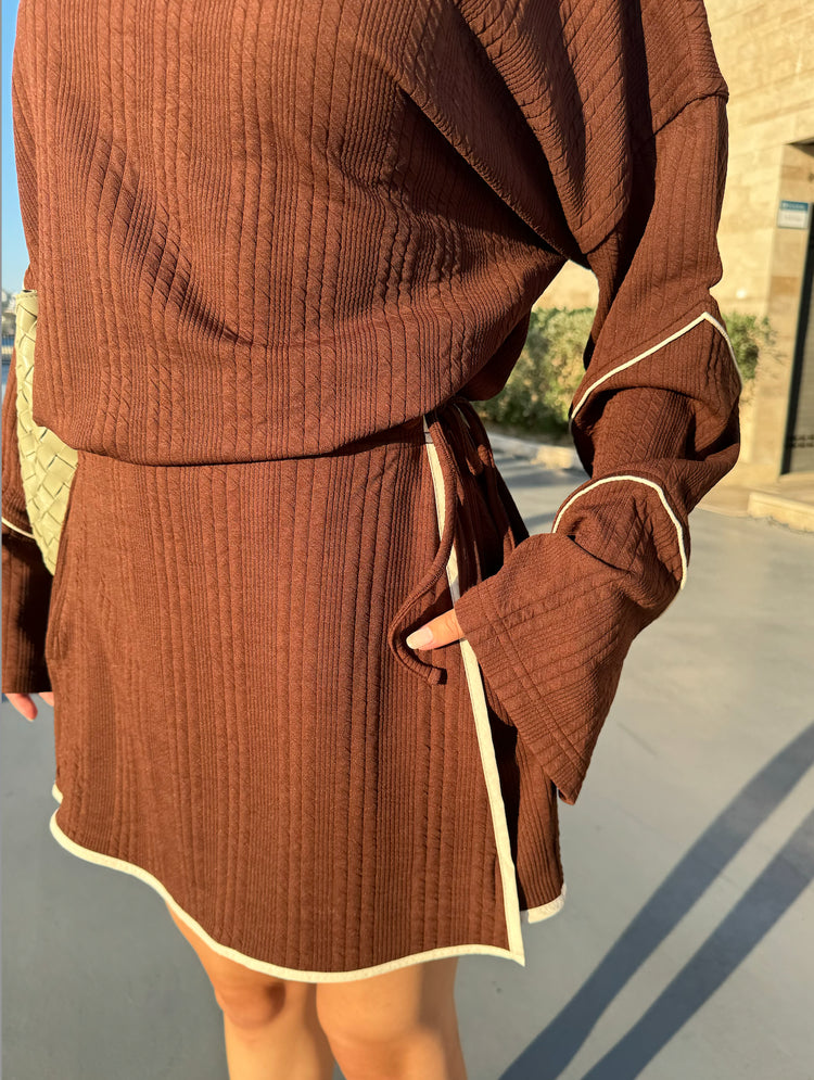 Bringing together comfort and elegance, this set offers a modern style with its oversized long-sleeve blouse and skirt-style shorts. Enhanced with contrast stitching details over the brown tone, the design is both comfortable and eye-catching for everyday wear. Its soft texture ensures all-day comfort.