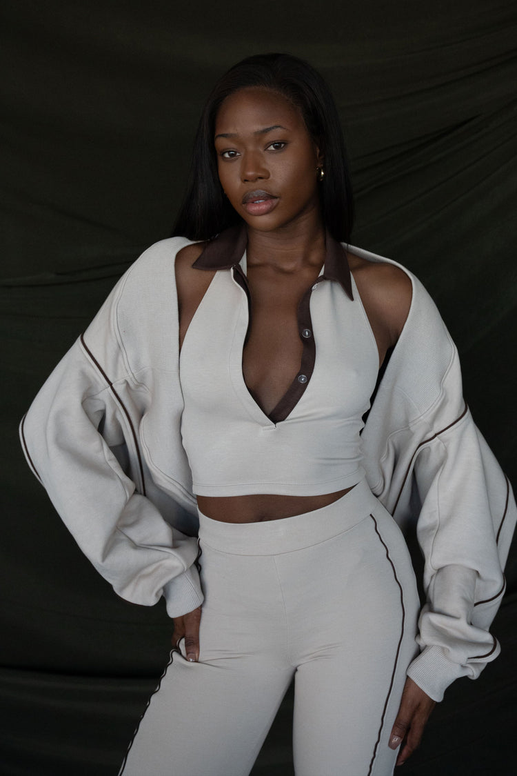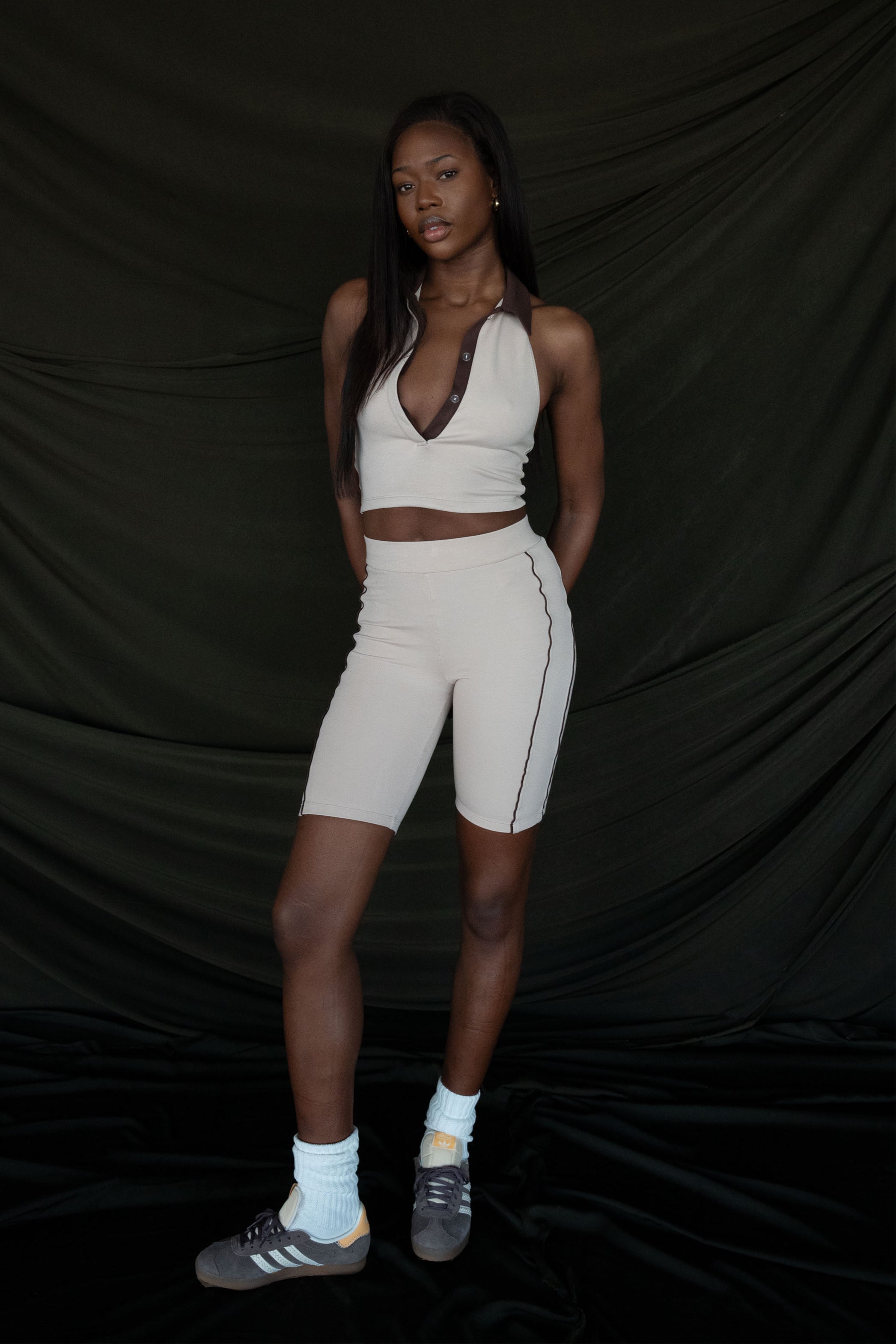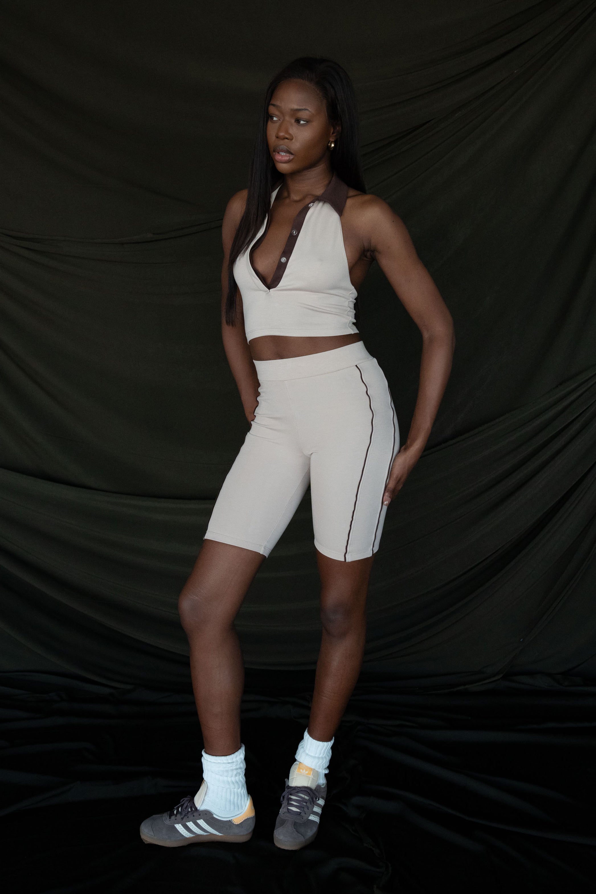 Combining elegance and comfort, the Nude Halter Neck Crop Top is set to become a wardrobe essential. Its body-hugging fit and deep V-neckline create a feminine silhouette, while the retro-inspired cream piping adds a unique touch.